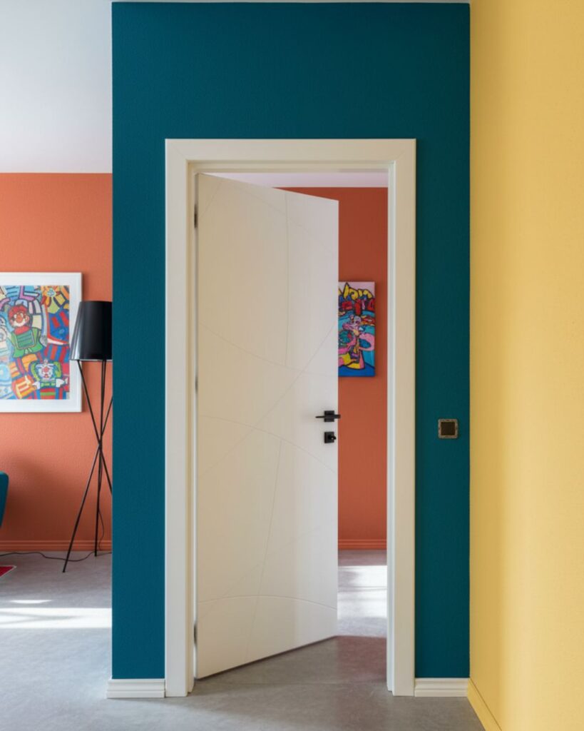 Бели врати + цветни стени – тук вратата играе ролята на неутрален акцент, който подчертава смелите цветове.