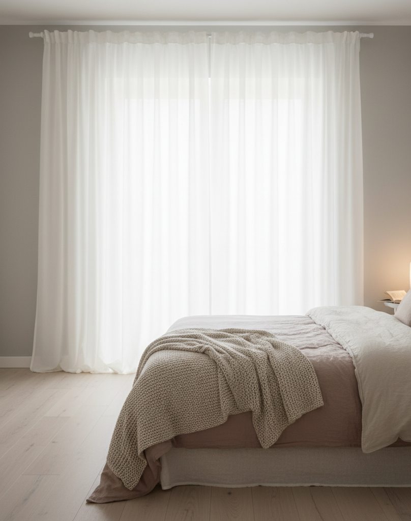 - Памучен воал или органза в бяло или кремаво филтрират светлината като сънна мъгла, създавайки атмосфера на нежност. Идеални са за спални, където търсите усещане за уют.