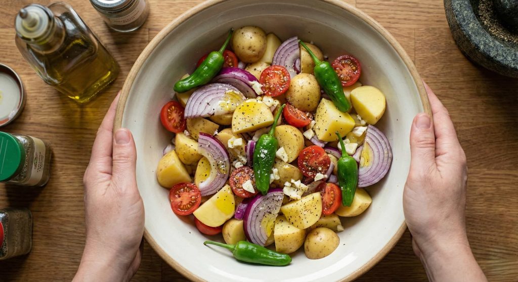 Обелете картофите и ги нарежете на средно големи парчета или дебели кръгчета. Останалата глава лук нарежете на едри резени. Домата разделете на осминки. Ако използвате люти чушки, нарежете ги на парчета.